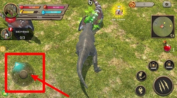 3. 左下角的圆形虚拟摇杆可以用来操控霸王龙的移动方向,结合右侧的攻击技能按钮,能够实现灵活的走位,并迅速追击目标。