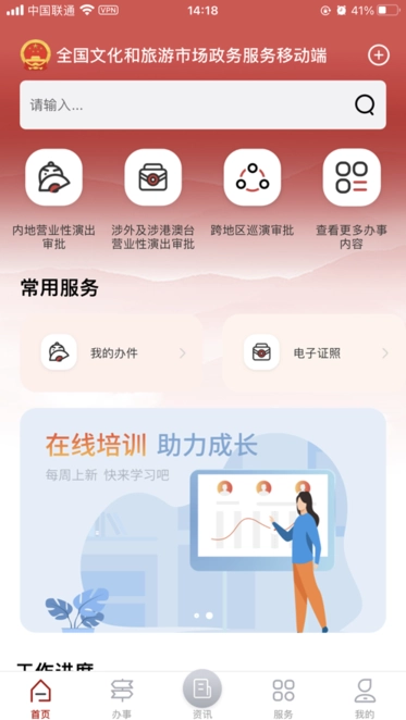 文旅市场通是文化和旅游部市场管理司负责运行维护的全国文化和旅游市场政务服务移动端平台,是实现文旅市场政务服务“掌上办”“指尖办”的关键载体。该平台涵盖政策资讯发布、行政审批办理、在线培训学习、电子证照应用等核心服务事项,同时为用户提供营业性演出、跨地区巡演等业务办理入口,以及通知公告、政策法规、办事进度等查询服务功能。