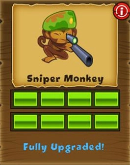 狙击猴,拥有全屏幕的射程范围,但射速较为缓慢。初始状态下,每发射一枪能够穿透两层气球。在此建议,点击该角色后,选择“strong”攻击模式。