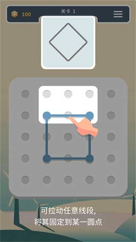 前十关攻略:玩家拉动线段固定圆点,匹配上方目标图形。关卡难度递增,初期注重基础操作。