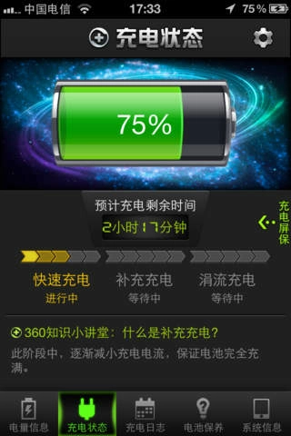 360电池医生是一款电池检测工具软件,其界面设计简洁直观,方便用户快速上手。借助智能电池管理算法,它能依据用户的使用习惯生成个性化节电方案,提供多种省电模式,且可根据不同使用场景灵活切换,从而有效降低不必要的后台能耗,延长电池续航时间。在充电时,该软件还能实时显示充电进度,并在电池充满后及时发出提醒,帮助用户避免过度充电的问题。