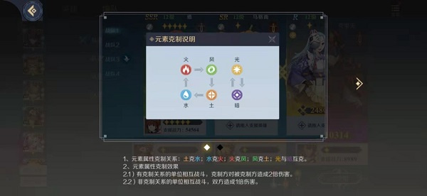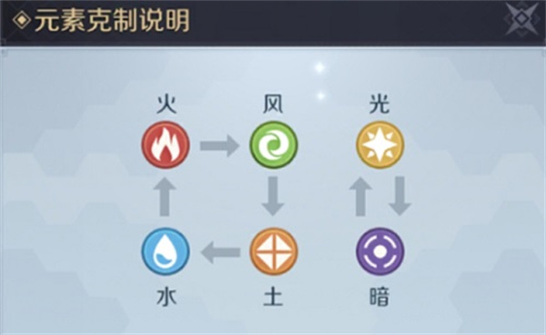 搭配英雄阵容的过程中,玩家们除了要关注英雄本身的品质外,还要关注英雄的属性,因为游戏里不同属性之间存在着相互克制的关系。基本属性一共有6种,分别是:土、水、火、风、光、暗。其中土、水、火、风四种元素循环克制,土属性克制水属性,水属性克制火属性,火属性克制风属性,风属性克制土属性,而光、暗两种属性则是互相克制。当有克制关系的单位互相战斗的时候,克制方对被克制方造成2倍伤害。