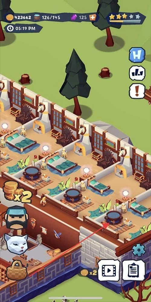 2、通过点击不同建筑,如宿舍、厨房等,管理内部设施和人员安排,提升运营效率。