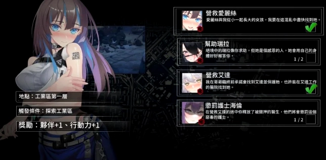而本作的故事推进则是依靠玩家每日的探索选择,任务选单会描述如何触发条件,而玩家最多能够获得两位伙伴,游戏中最主要的伙伴则是主角的女友爱丽丝,以及哥哥的医师女友艾达。