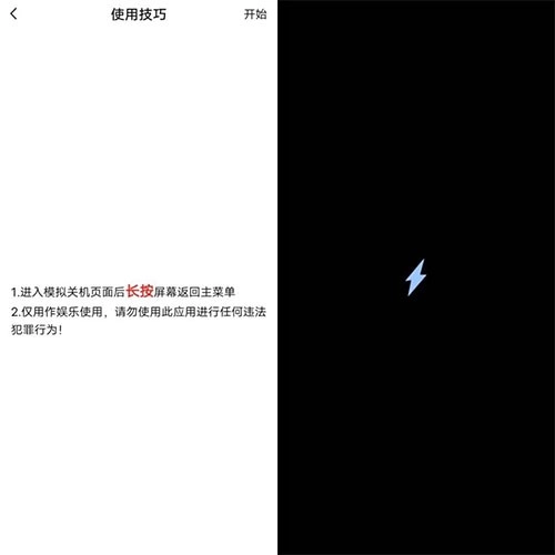 这个功能操作很简单,只需点击“开始”就能模拟关机界面,长按屏幕就能回到主菜单。