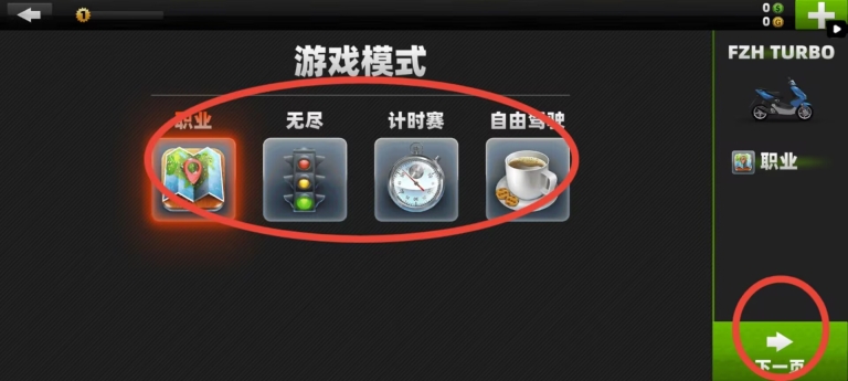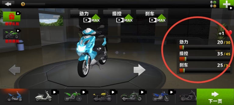 1进入车库界面后,右侧的面板会详细列出当前摩托车的各项性能参数,比如引擎功率、转向灵敏度以及制动距离等关键数据。