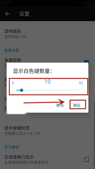 左右拖动滑块可更改白色键数量,按键越少则琴键越大