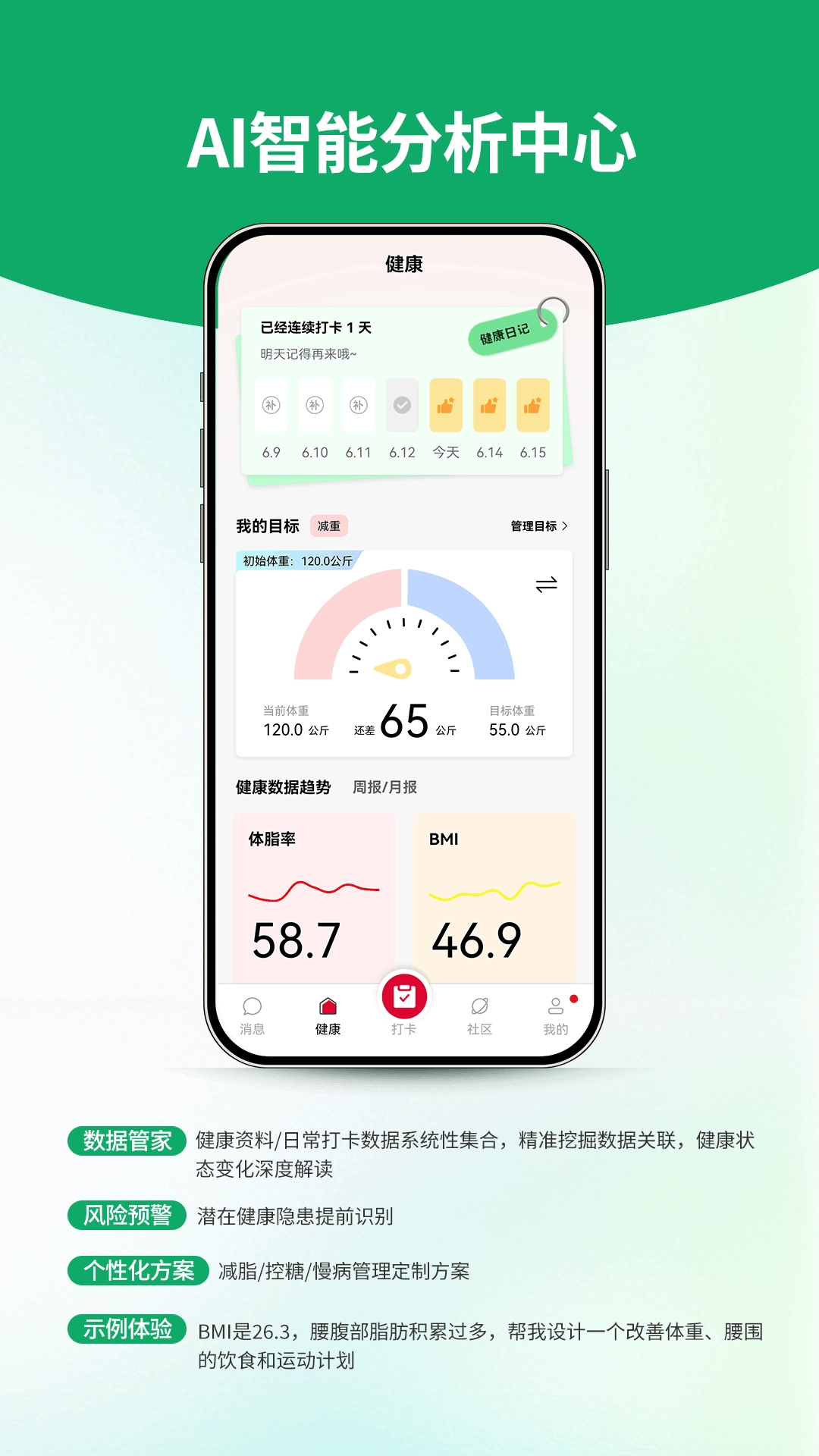用户需要每天按要求完成健康任务打卡,完成后就能记录个人的健康信息。