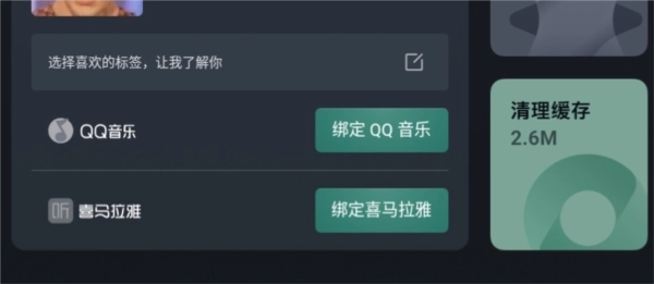 支持绑定百度、QQ音乐以及喜马拉雅账号,其中QQ音乐和喜马拉雅账号绑定后能够播放会员专属内容。