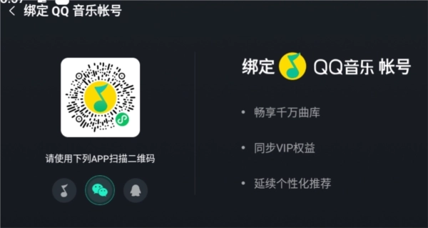 最后你可以通过三种方式完成绑定:一是用QQ音乐扫描二维码,二是通过微信绑定,三是借助QQ绑定。