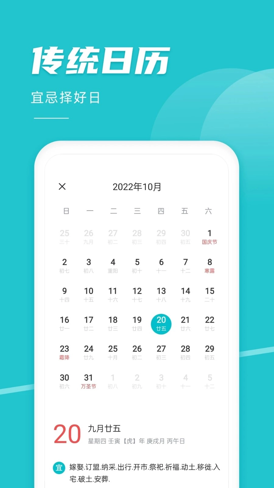 支持日历查询功能,只需选择具体日期,就能查看对应的节气、节假日、农历以及宜忌等相关信息。