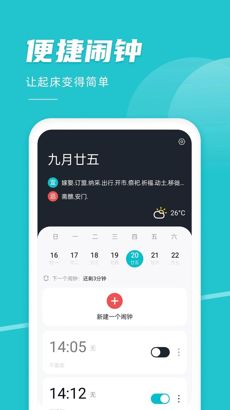 准点闹钟是一款实用的闹钟工具,它不仅具备基础的响铃提醒功能,还了日历工具,能全方位帮助用户把控每日的日期与时间,助力用户准时起床、入睡、上班等;用户只需将该软件安装到手机上,就能自由设置闹钟进行提醒,一次性可管理多个闹钟,系统会依据用户的设置准时发出提醒,让用户及时知晓待办事项。在此基础上,用户还能随意创建不同类型的闹钟,满足多样化的生活需求,适配各种生活场景;因此,想要准时处理事务的用户,不妨来体验这款软件,助你精准掌握时间,避免错过重要事项。