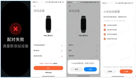 在进行绑定操作时,如果关闭Android手机的蓝牙,手环会弹出“配对失败”的界面,小米手环也会显示绑定失败;此时若点击“重试”按钮,App会弹出提示用户开启蓝牙的提示框,只要重新打开蓝牙,就能成功完成绑定。