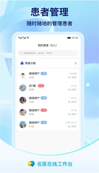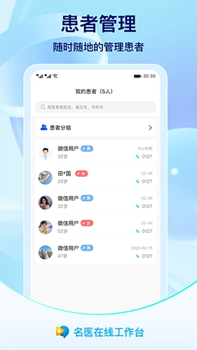 名医在线工作台是一款优质的健康医疗服务软件,医生可标记重点患者,随时查看已接诊患者的档案和就诊记录,便于后续问诊与追踪,实现对患者就诊记录的监控。该软件能快速匹配有效患者,支持医生随时随地在线问诊;还提供专业科普内容,助力医生打造个人品牌。