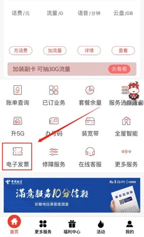 一、打开安徽电信,在首页点击【充话费】或【加流量】就能完成充值操作。