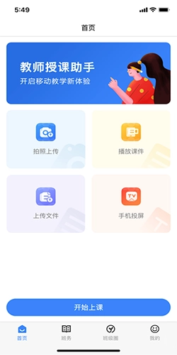 采用模块化设计思路,主界面划分出课件、互动、班务、我的四大功能板块,每个模块都配有清晰直观的图标以及详细的操作引导。
