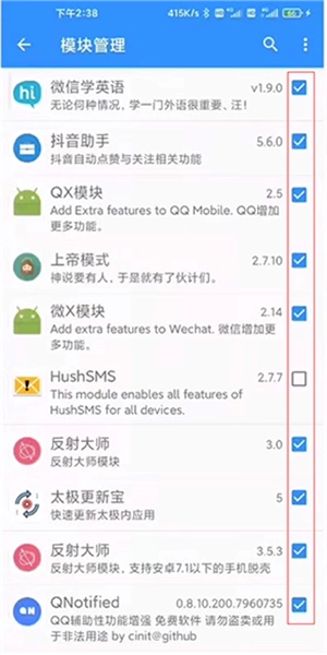 打开模块管理就能看到已安装的模块,勾选模块时会提示该模块支持的应用版本,应用版本可在太极主界面查看,版本不兼容则无法使用模块。