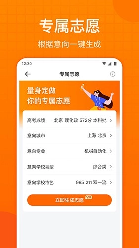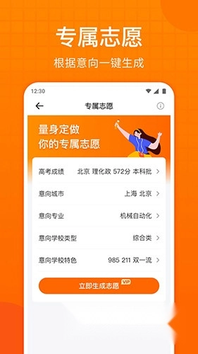 【专属志愿】在院校推荐的基础上,考生能够依据自身对意向城市的地理位置、学校类型、意向专业等方面的考量,进一步生成属于自己的专属志愿。