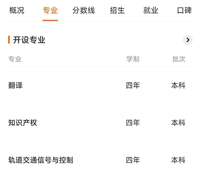 进入学校的详细页面后,切换到专业栏目,就能查看该校所开设的专业了。