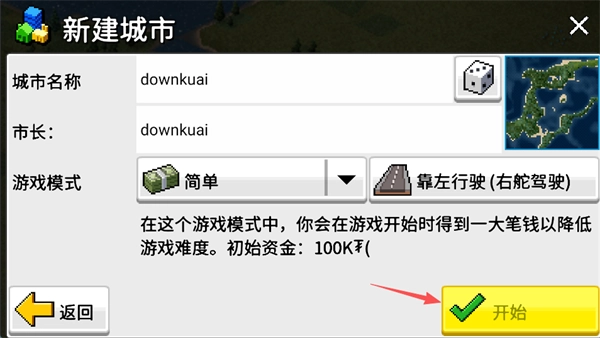 游戏模式:新手强烈推荐「简单模式」,开局直接获得 100K 初始资金,降低建城难度。
