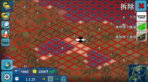 (2)用「平整土地」工具,把起伏的山地、水域填平,留出足够的平坦区域用于建设,「拆除」界面的红 / 蓝网格,是地形高度参考,尽量把核心区域统一到同一高度,避免道路、建筑错位预留出河流、绿地等自然景观,提升后期城市满意度。