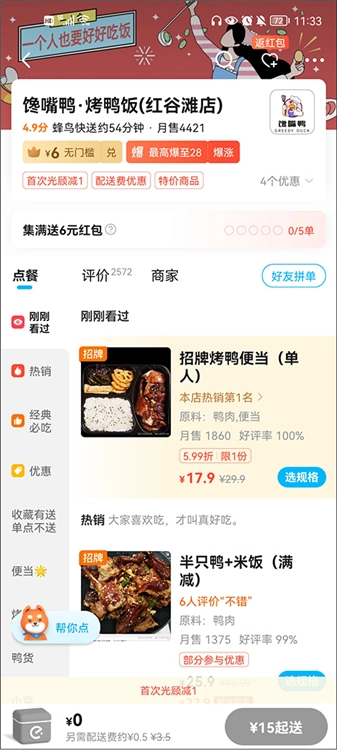 首先我们打开饿了么,接着选择自己心仪的餐厅(小编这里以起送价15元的餐厅为例进行示范,通常只有标注了具体起送金额的餐厅才需要拼单)。