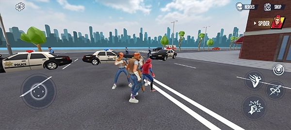 游戏的玩法十分简单,你只需在生命值有限的情况下击败游戏里的所有歹徒,左侧用于控制角色的方向,右侧则分布着各类技能按键。
