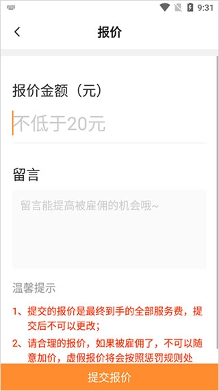 在报价页面,依据服务需求填写合理的服务价格、预估服务时长等信息,确认内容准确无误后,点击屏幕右下角的“立即报价”按钮,即可进入提交确认环节。