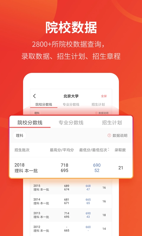 找大学、查专业:当年招生计划、历年院校分数线、专业分数线都能轻松掌握;专业介绍、开设院校、就业前景、薪酬分析报告可一站式查询。