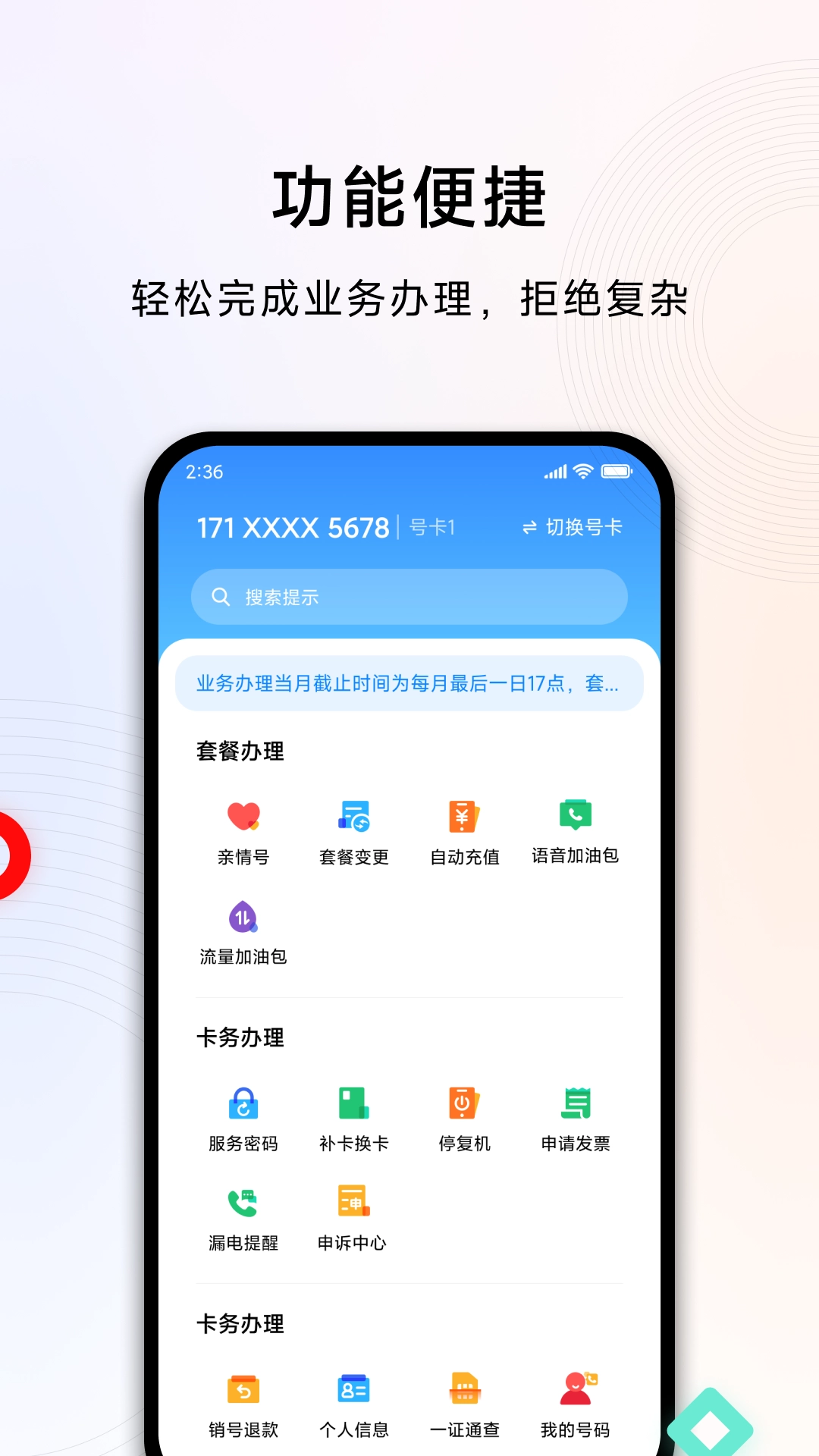 强大的网上营业厅,充话费、查流量、办理业务,一个App全搞定。