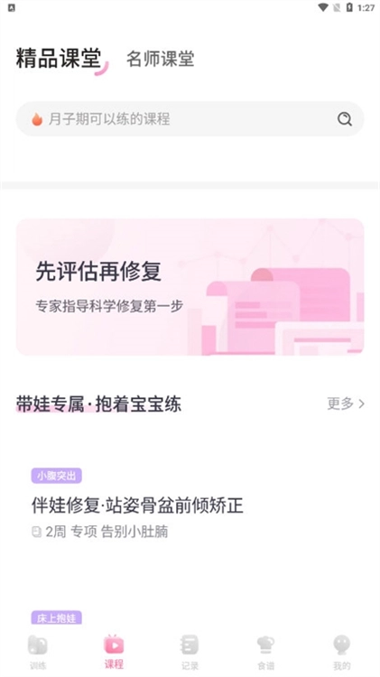 除了盆底肌训练外,还设有体重、腹直肌分离度、身体三维等数据的追踪模块,同时提供产后功能食谱等健康管理功能。