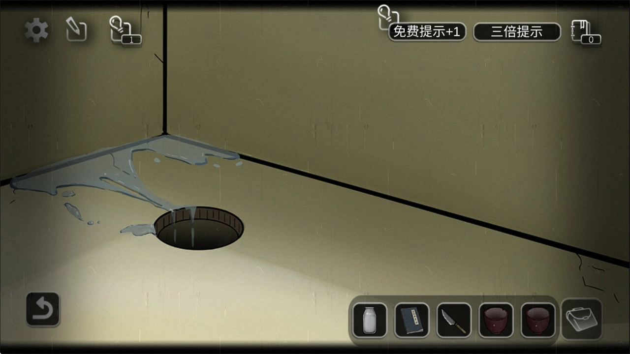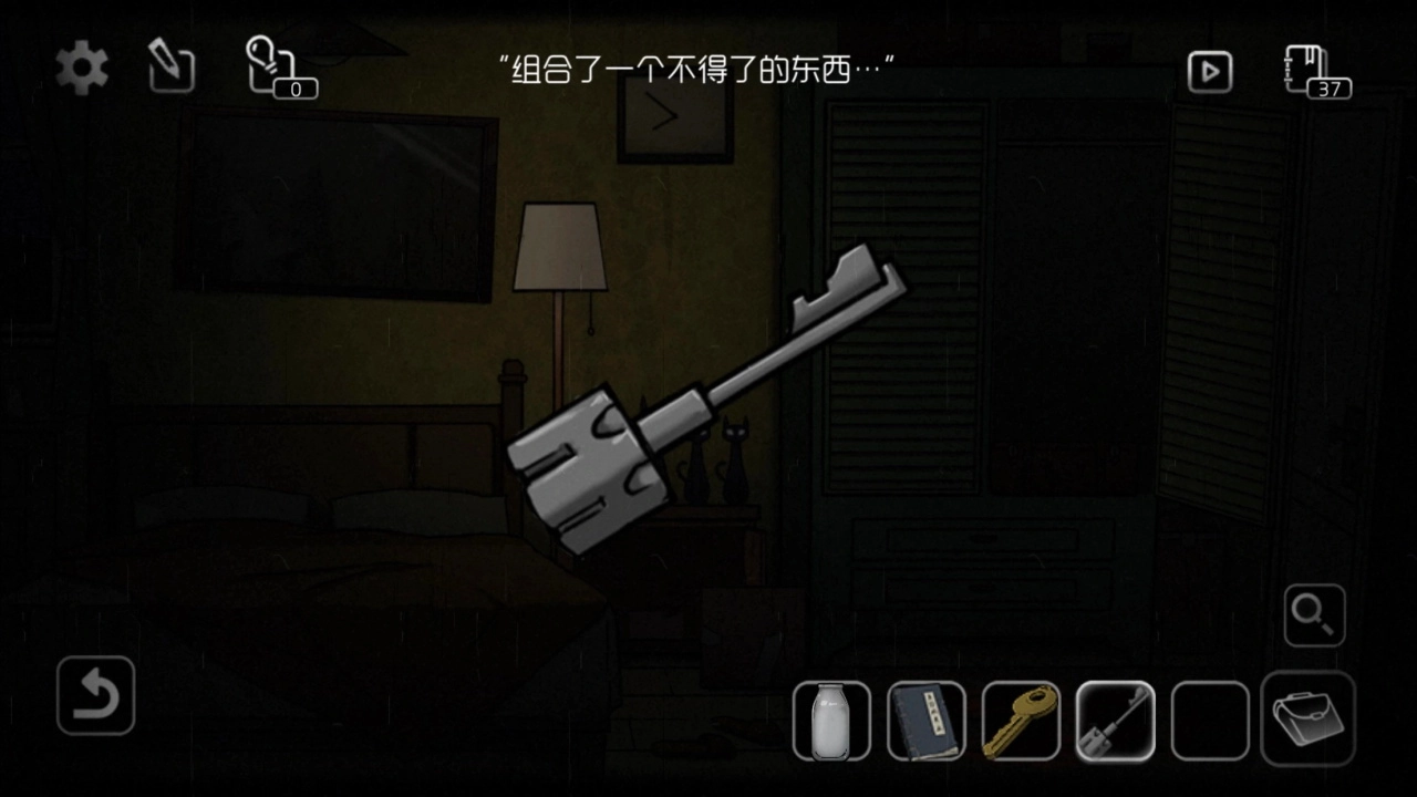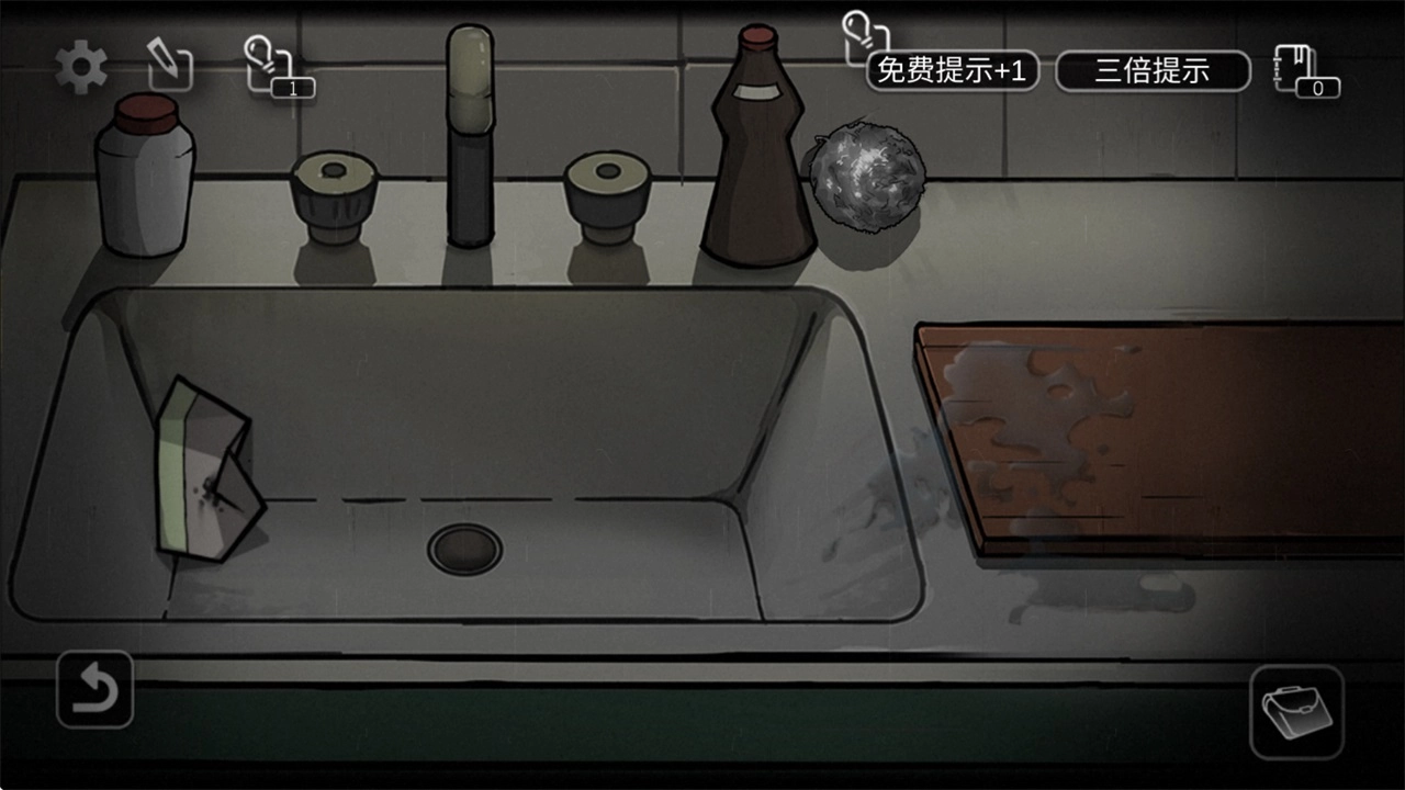 15、用钩子钩起浴缸下水管里的钥匙,自动打开卧室(但是钥匙会断,钥匙上半截的图案是后面的提示)。