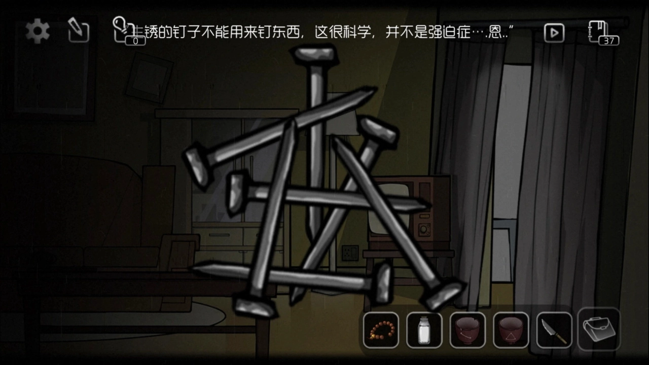 1、在马桶中获得【卡片:牙】。洗衣机上恶魔相框上获得【卡片:眼】【卡片:猫】。女子相框上获得【卡片:十字】【卡片:叶子】。镜像中男子相框里获得【卡片:鸟】。