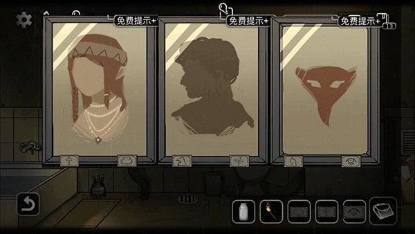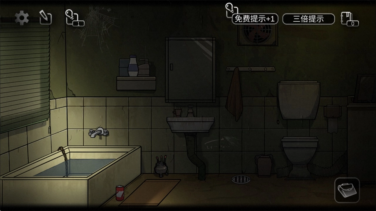 13、点击浴缸放水,触发对话。点击旁边的百叶窗,发现小纸条重新排列的规律,把那个收集的小贴纸贴回那三幅画,就可以打开通风口,拿到一个零件。
