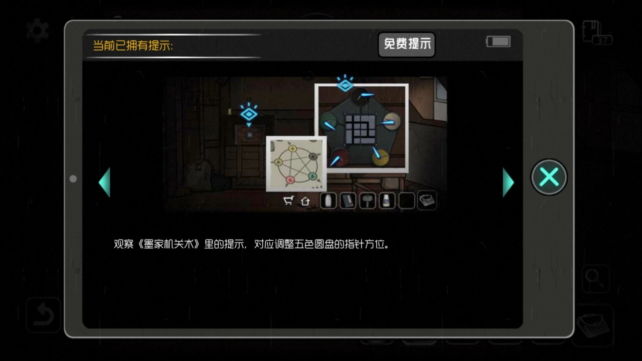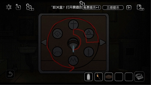 4、黄桶中获得【某种装置】,插入装置钥匙,利用(提示1 2)解开,如图↓。获得【铁钩】
