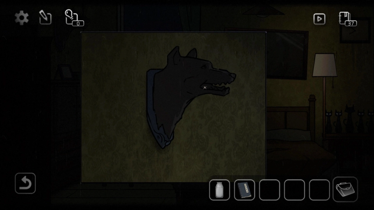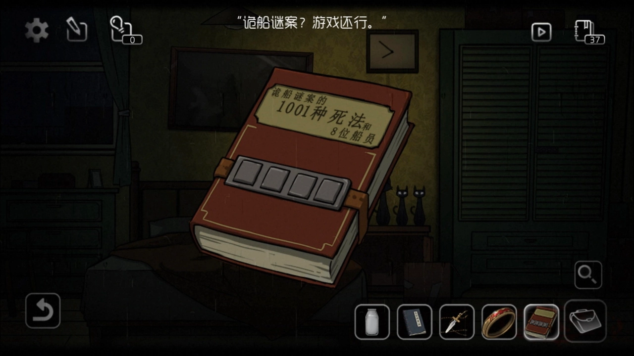 3、搜索:衣柜左柜门→【猫头1】【宝剑吊坠】。衣柜右下角→【猫头2】。两个枕头中间→【毒蛇饰品】【诡船迷案——密码本】。窗下柜→【猫头3】。狼头标本→【狼牙】。