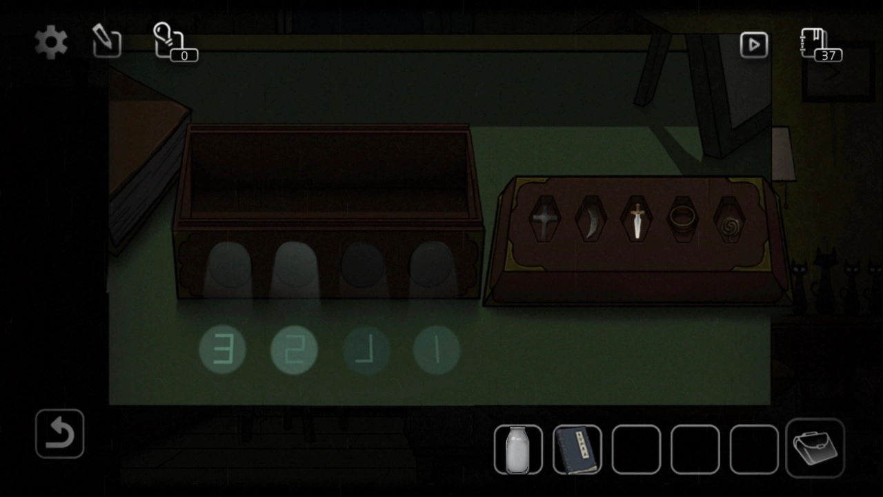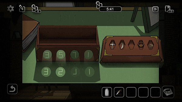 6、窗下柜子饰品盒,参照《末世》中的人物顺序,将【十字架】【狼牙】【宝剑吊坠】【戒指】【毒蛇饰品】依序放入凹槽。获得(密码:5317)如图↓。【宝剑吊坠】可收回物品栏。