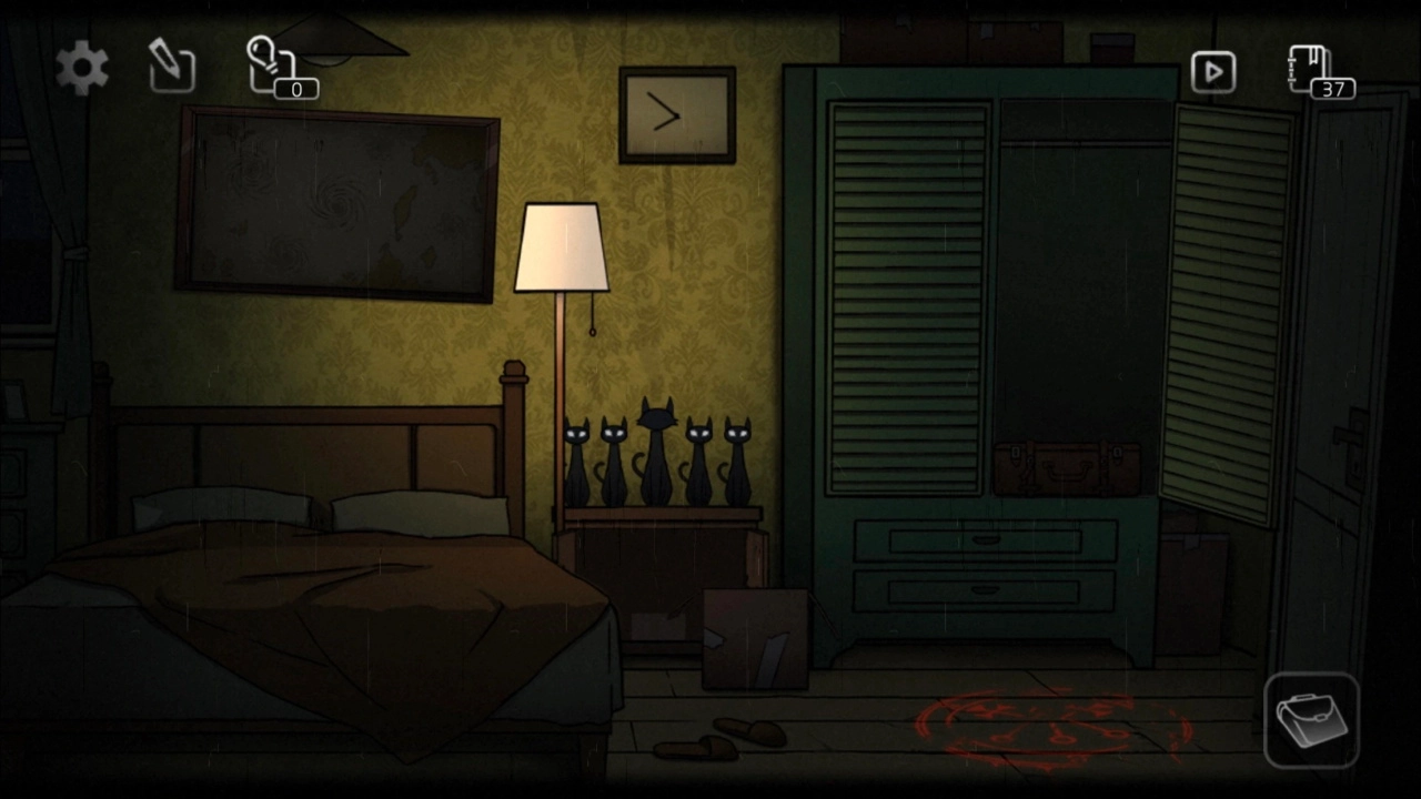 27、点击卧室衣柜左侧,找到一个猫头和衣服口袋里的匕首项链。衣柜底下有一个猫头,书桌上赤裸裸的放着一个猫头。把猫头都安回去。床的枕头之间发现了一本书和一个蛇形吊坠。点击床上的图片发现提示。