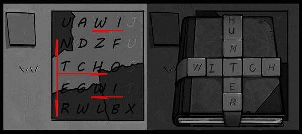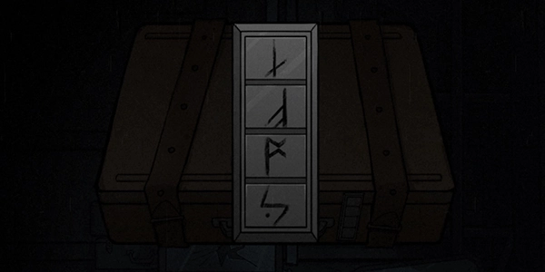 2、点击平躺的镜子获得(符文1)——根据KILL的方向和镜像关系分辨正确符文写法。捡起立着的镜子上的【破布条】擦掉皮箱上的灰尘,获得(符文2)——根据HUNTER分辨方向。立着的镜子上获得(符文3)。地面上获得(符文4)。用(符文1234)的上下关系解开皮箱密码,获得【门把手】【榔头】如图↓。