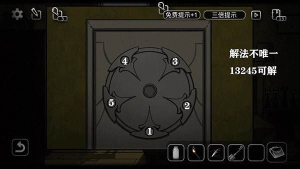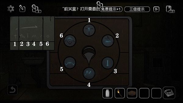 把所有的都点亮,露出钥匙孔,用手枪零件做的钥匙打开,这里点亮了四个要熄灭一次才能全部点亮,很容易。