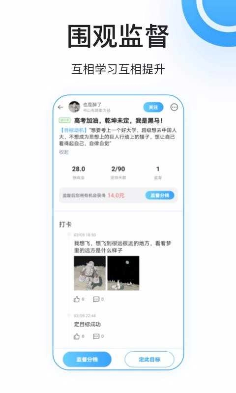 在线上分享自己通过打卡培养好习惯的心得,还能和目标监督人自由地互动交流。