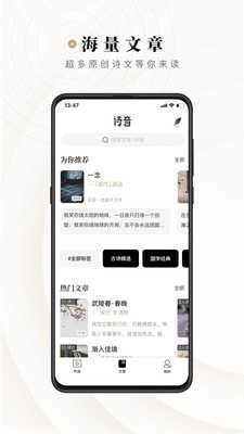 【海量诗词】拥有丰富的诗词资源库,不仅收录了中外众多名家的经典作品;还支持上传个人创作的原创诗词,有机会成为认证作者。