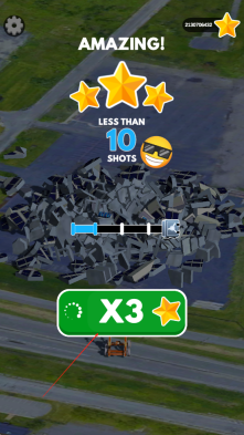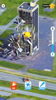 3、在成功拆除所有目标建筑后即可通关,根据破坏的效率和建筑倒塌时的美观程度来获得星级评价,并解锁“核弹炮弹”等强力道具。
