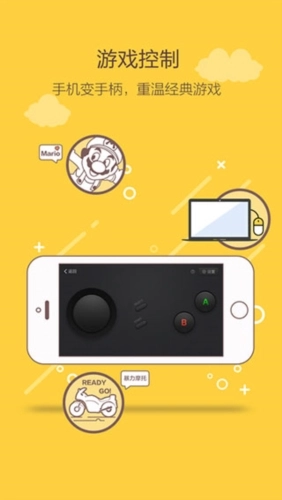 手机变身为游戏手柄,让游戏体验更加顺畅自如。目前已支持小霸王/红白机平台的经典游戏,像超级玛丽、暴力摩托、炸弹人、双截龙、冒险岛、热血足球、三目童子、雪人兄弟、马戏团、激龟快打、影子传说等;同时也兼容神庙逃亡、切水果这类热门体感游戏。后续还会持续更新,加入更多有趣的游戏内容。