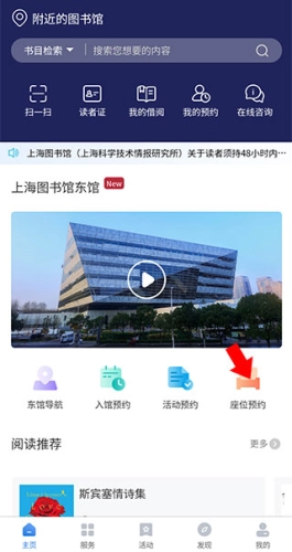 打开上海图书馆,在首页点击座位预约选项