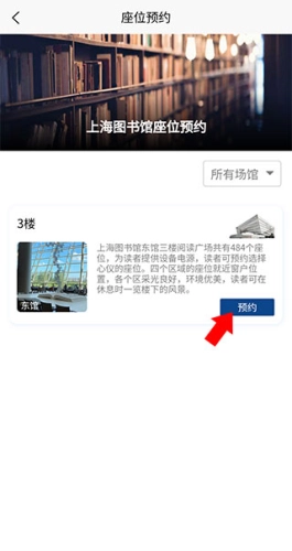进入座位预约界面后,找到你想预约座位的图书馆,然后点击右下角的预约按钮。