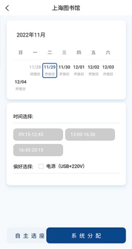 之后进入下方界面,我们选择好想要预约的日期时间,以及是否需要电源等需求,再点击下方的自主选座或者系统分配按钮就可以了。