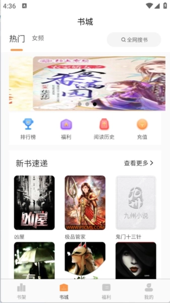 “书城”页面,有很多的小说资源分类。