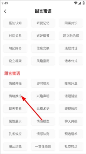进入话术选择界面,该界面包含情绪共振、即时聊天、话题铺垫、情感法则、聊天要素等不同类型与场景的聊天话术,点击对应的话术类型即可。
