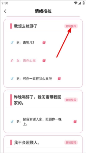 进入话术主页面后,能看到按男方、女方分类的话术模拟场景,用户若需要某句话,点击右上角的复制按钮就能完成复制。